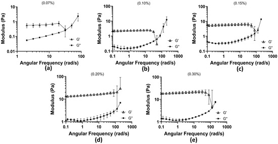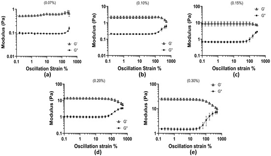Oscillation amplitude test across all concentrations as oscillation strain % vs. moduli (Pa): (a) 0.07% concentration; (b) 0.10% concentration; (c) 0.15% concentration; (d) 0.20% concentration; and (e) 0.30% concentration.