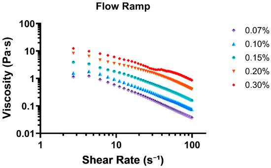 Flow ramp test displaying all 5 tested concentrations as shear rate (s−1) vs. viscosity (Pa·s).