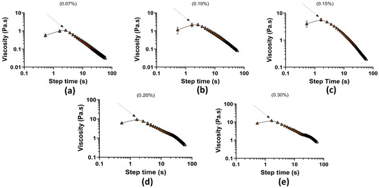 Stress ramp test as a function of time (s) vs. viscosity (Pa·s): (a) 0.07% concentration; (b) 0.10% concentration; (c) 0.15% concentration; (d) 0.20% concentration; and (e) 0.30% concentration.
