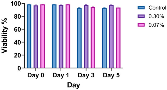 The viability assay confirmed that the mucus mimic had no significant effect on 16HBE14o- cell survival, indicating biocompatibility. Figure 5 presents quantified viability results across the minimum and the maximum range of XG-LBG concentrations examined in this paper. Data represent the mean ± SEM of six biological replicates (n = 6 wells per condition), with five images taken per well. The Kruskal–Wallis test was used to compare the viability between control, thin mucus, and thick mucus conditions at each time point (Day 0, Day 1, Day 3, Day 5). No significant differences in cell viability were observed between conditions (p > 0.05).