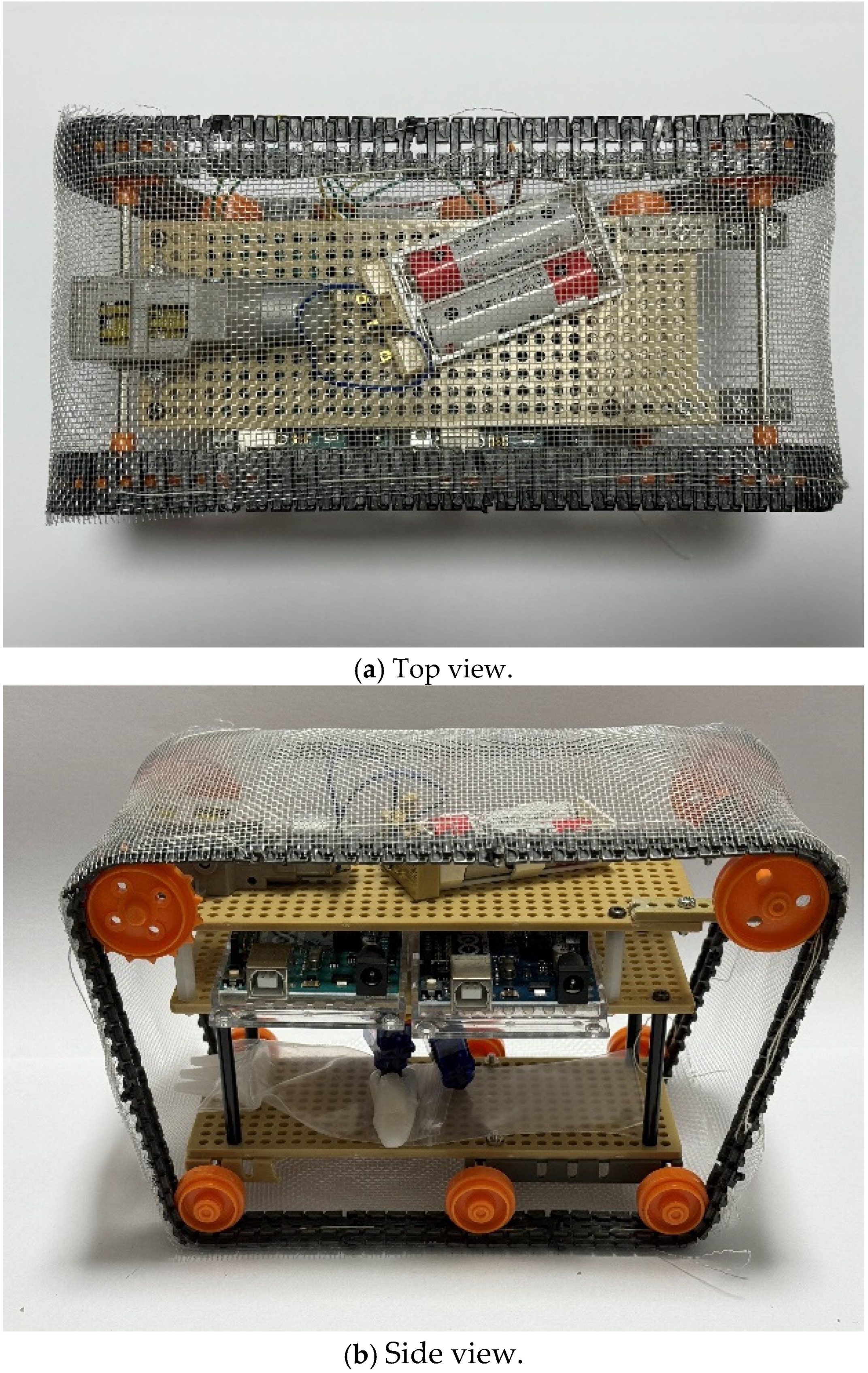Figure 4 shows the top and side views of the robot without the skin material. The skin covering the robot’s surface is sewn onto the robot’s endless tracks. The rotation of the skin is controlled by a servo motor via gears, which allows the robot to move forward and backward. The mechanism for extruding liquid into the skin to adhere and detach external materials will be discussed later. This mechanism is positioned at the center of the robot.