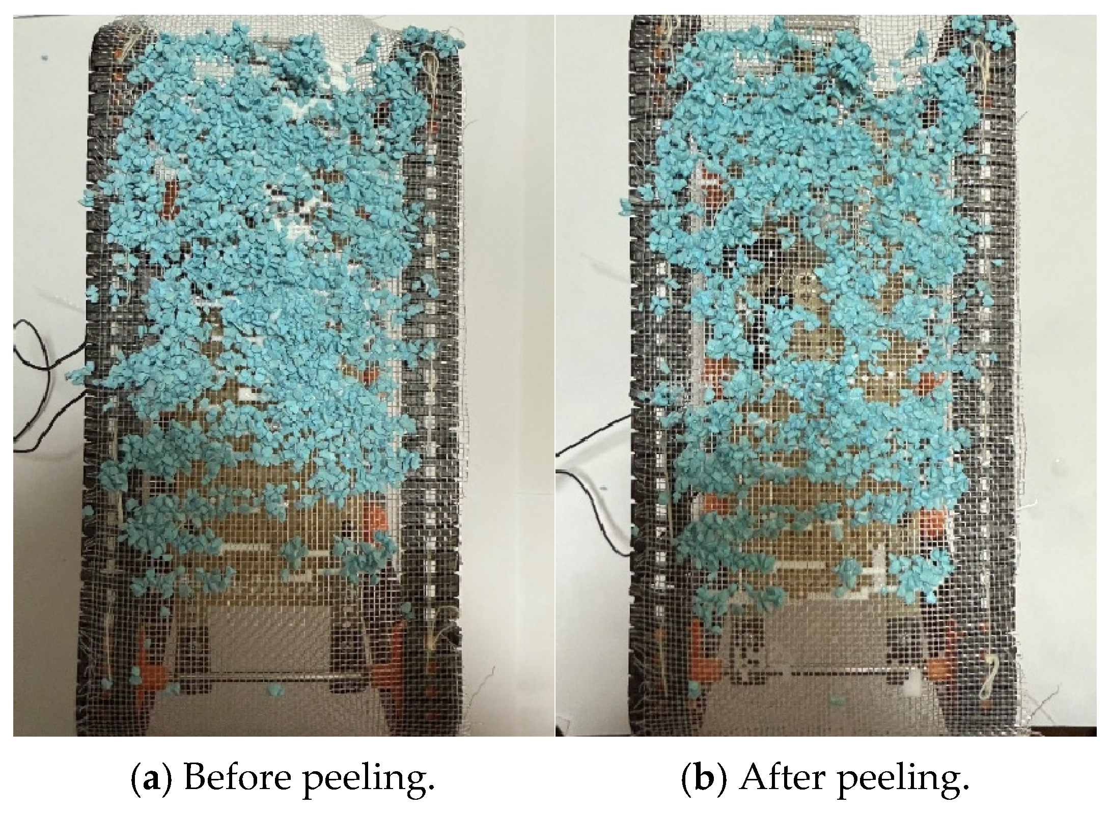 Robot appearance before and after peeling experiment when we used Color Zeolite. (a) The photograph before peeling (b) The photograph after peeling.