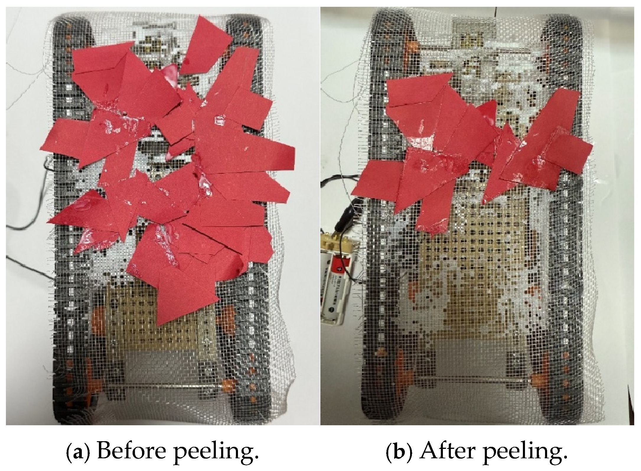Robot appearance before and after peeling experiment when we used papers. (a) The photograph before peeling (b) The photograph after peeling.