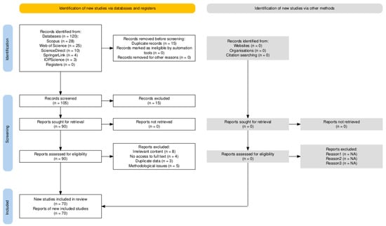 A total of 120 records were initially identified. After removing 15 duplicates, 105 studies were screened by title and abstract, leading to the exclusion of 15 irrelevant articles. The remaining 90 full-text articles were assessed for eligibility. Of these, 20 were excluded for the following reasons: irrelevant content (n = 8), no access to full text (n = 4), duplicate data (n = 3), and methodological issues (n = 5). A final set of 70 studies was included in the qualitative synthesis and analysis.