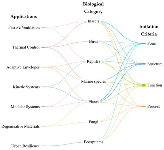 Figure 2 presents a tripartite relational structure that allows us to visualize the flow of biomimetic inspiration, from architectural functional needs to defined imitation criteria, passing through specific biological categories. Organized from left to right, the diagram connects seven key applications, with the organisms grouped into seven biological groups, which, in turn, lead to the selection of biomimetic criteria.