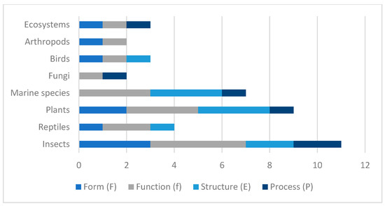 In the insect category, the imitation criterion related to function (f = 4) is the most frequently present, followed by form (F = 3), structure (E = 2), and process (P = 2), as evidenced by applications such as termite mounds, dragonfly wings, and beetle exoskeletons [6,22,36]. In the reptile category, the most representative imitation criteria are function (f = 2) and form (F = 1), while structure (E = 1) and process (P = 0) are less relevant, based on biomimetic strategies derived from snake scales and chameleon skin [25,41,42]. For plants, a balanced distribution of the criteria is shown, with a high presence in function (f = 3), structure (E = 3), and form (F = 2), while process is less represented (P = 1), reflecting inspiration from lotus leaves, photosynthesis, cell walls, and pinecones [24,41,43,44,45,46,47,48,49,50,51,52,53,54,55,56,57,67,68,69]. Marine species show a significant preference in imitating function (f = 3) and structure (E = 3), with a lower presence in process (P = 1) and an absence of imitation in form (F = 0), as illustrated by applications based on coral reefs, echinoderms, and jellyfish [21,29,70,77]. Fungi present an application through the criteria function (f = 1) and process (P = 1), while form and structure (F = 0, E = 0) do not show significant records, particularly from the species Pleurotus ostreatus [80]. Birds present an equal distribution in the criteria form (F = 1), function (f = 1), and structure (E = 1), while the process is not represented (P = 0), as shown in studies on nest morphology and penguin thermal regulation [13,14,23,25,81,82,83,84]. In the arthropod category, largely represented by spider webs, low values are identified in all the criteria, with a slight predominance in form and function (F = 1, f = 1), while structure and process do not present values (E = 0, P = 0) [12,23,26]. Finally, ecosystems show a homogeneous distribution in all the criteria, with low values in form, function, and process (F = 1, f = 1, P = 1) and an absence of imitation in structure (E = 0), based on systemic inspirations from forests, wetlands, and rivers [23,24,25,26,29,85].