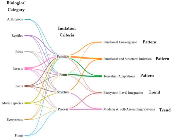 Figure 4 shows the interconnected relationships between the biological categories, imitation criteria, and main patterns and trends identified in the construction industry. The diagram represents how eight distinct biological sources contribute to the four main imitation criteria, which, in turn, relate to different application types, organized into three observed patterns—functional and structural imitation, functional convergence, and terrestrial adaptations—and two emerging trends—modular and self-assembling systems, and ecosystem-level integration [6,12,13,14,21,23,24,25,26,29,57,70,71,72,74,75,76,77,78,79,80]. The width of each connection reflects the relative frequency and strength of the association observed across the reviewed studies. Notably, the predominance of function and structure as imitation criteria supports a performance-driven design paradigm, while the consistent recurrence of specific biological categories—particularly insects and plants—highlights their relevance in current biomimetic strategies [21,22,23,24,25,26,27,28,29,30,31,41,42,43,44,45,47,48,49,50,51,52,53,54,55,56,57].