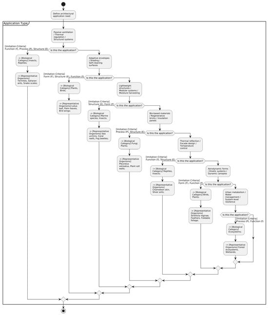 Figure 5 illustrates the proposed flowchart, which maps the relationships between the application types, imitation criteria, biological categories, and representative species. The diagram is designed to be used as a practical tool in the early design phases, where architects and researchers can define a performance-based need and follow a guided path toward identifying natural models that have inspired successful solutions in similar contexts. For instance, if a design team seeks to address passive thermal regulation, the diagram directs them to consider criteria such as function and structure and biological analogues like termite mounds or Saharan ants, which have informed naturally ventilated architectural solutions in extreme climates.