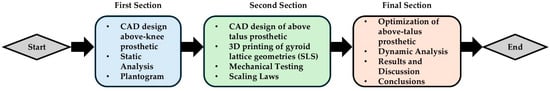 In the current study, the development of a novel prosthetic foot for TATTR with anthropomorphic design and the insertion of bioinspired gyroid lattice geometries was investigated. The insertion of TPMS lattices, and especially the gyroid geometry, allows for the enhancement of the energy absorption properties and shape-recovery properties which are vital for the accurate mimicry of joints, tendons, or ligaments. FEA and plantogram-derived foot pressure data were utilized to enhance the accuracy of load simulations during various movement phases (walking, running, and jumping). In the first section, a CAD design of a conventional above-knee prosthetic was followed by static analysis simulations to assess the forces that the lower above-talus region handles during standing. Then, an anthropomorphic lower prosthetic limb was designed with the aid of 3D scanning from an actual human foot. In the second section, an investigation of the optimal relative density of the proposed gyroid structure was conducted for the case of a hyperelastic thermoplastic composite material (TPU), with the aid of Selective Laser Sintering (SLS) AM. The 3D printed unit cells went under uniaxial compressive loads to assess the minimum adequate relative density for the development of the prosthetic foot in correlation with the maximum stress derived from the plantogram and the calculation of the structure’s scaling laws. In the third section, the evaluation of the structural integrity and the response of the proposed final design was conducted with the aid of Finite Element Analysis. The experimental results showed that the application of a hyperelastic TPU-based material on a gyroid lattice geometry design positively influenced the damping capabilities of the final design, allowing for unified stress distributions aligned with the actual plantogram data, making it adequate for possible manufacturing. The workflow of this study is briefly illustrated in Figure 1.