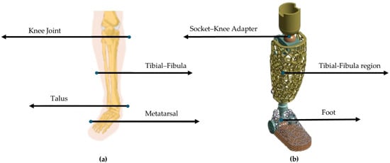 Conceptualization of the above-knee prosthetic design: (a) Human anatomy of leg region [] and (b) Derived above-knee prosthetic for static integrity evaluation.
