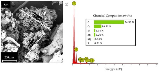 For the material selection, a Thermoplastic Polyurethane matrix, with carbon black traces for increased strength, was selected in powder form (Sinterit™, Krakow, Poland). It was reinforced with reacquired Ground Tire Rubber (GTR) [,] from RETIRE ABEE, Drama, Greece, which was shredded from end-of-life automotive tires into small pieces, along with the removal of the steel wires with the aid of magnets, and then the final milling of the rubber was made into a fine powder form, compatible with the matrix material. The blend was conducted in previous research with gradual mixing. The final blend consisted of 10 wt. % GTR. In Figure 4, an indicative particle morphology and size, as observed with the aid of Phenom ProX (Thermo Fisher Scientific, Waltham, MA, USA) Scanning Electron Microscope (SEM), is presented (Figure 4a), along with the EDX analysis of GTR (Figure 4b).