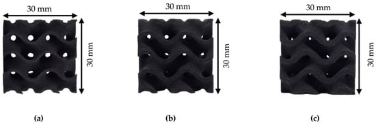 As-printed gyroid cubic unit cells (30 × 30 × 30) for: (a) 20% relative density; (b) 30% relative density; and (c) 40% relative density.