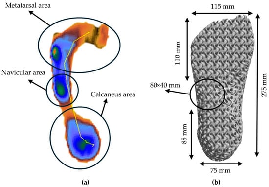 For the topological optimization of the proposed above-talus prosthetic limb, the nTopology™ Version 5.9.2. (nTopology Inc., New York, NY, USA) was utilized. The shape of the structure was designed in alignment with the Regions of Interest that were extracted from the plantogram contours. For the evaluation of the optimal lattice geometry parameters, the optimal solution in terms of weight and functionality was identified according to the equivalent scaling laws described in Equation (5). For the evaluation of the scaling laws, 3 different relative densities were tested (20% r.d., 30% r.d., and 40% r.d.). As mentioned, the proposed lattice geometry was the TPMS gyroid structure. TPMS-based structures present the greatest energy absorption and damping efficiency, which are key factors for the overall integrity of lower limb human prosthetics []. In Figure 6, the plantogram contours while standing (a), and the final proposed design with the metatarsal and calcaneus area dimensions (b) are presented, with a focus on creating an adequate landing area (metatarsal and calcaneus) to provide stability.