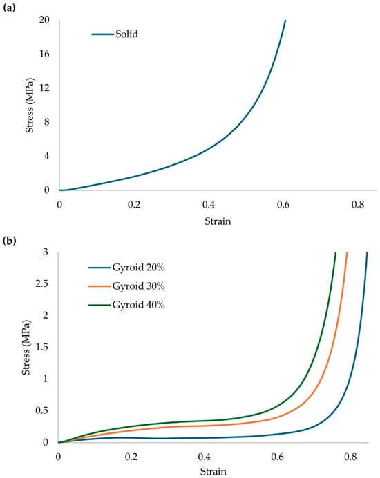 From the results of Figure 8, it is visible that there is a significant drop in the overall strength of the structure with the insertion of lattice geometries. It is also visible that a proposed structure with 20% relative density would not be able to handle the compressive stresses of an actual human (0.42 MPa) during an intense activity. TPU/GTR composites present excellent shape recovery ability, but in loads higher than the densification point, the recovery time is relatively short, meaning that the structure will keep the deformed shape during repetitive loads in this range. This could lead to diminishing absorption properties and leading to discomfort in other joints of the human body (knees, hips) resulting in possible injuries. In Table 4, the main mechanical properties are presented for the solid structure and the structures with lattice geometries.