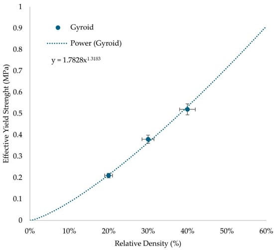 The results from Table 4, were used to describe the distinct behavior of the compressive stress at the densification point of the gyroid structure. With the aid of Equation (5), the main constants that describe the scaling laws for the proposed structure were extracted. Those constants are material and lattice geometry dependent. The results are presented in Figure 9.