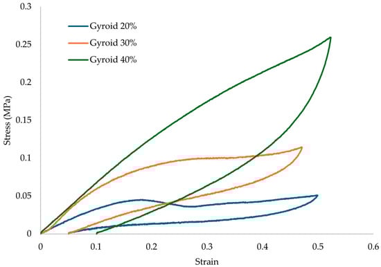 The results of the compression testing for the different relative densities of the proposed gyroid architected material are presented in Figure 8.