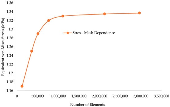 From Table 7, it is visible that the aforementioned material presented similar mechanical properties regardless of the axis of the applied load. Therefore, the isotropic elasticity model was utilized to describe the material used for the development of the human prosthetic model. In Figure 11, the mesh convergence study results are presented for the final prosthetic foot model.