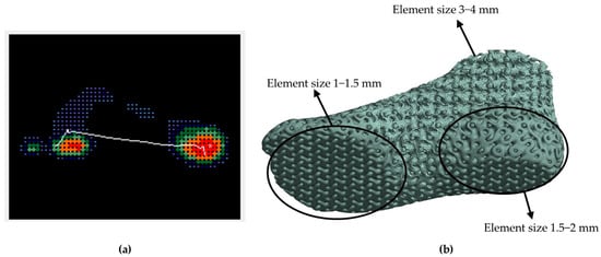 In alignment with the plantogram contours, the ROI that were identified had finer mesh with an element size 2–3 times smaller than the non-contact regions. This element ratio was kept similar in all cases. The results in Figure 11 confirm that with this element size distribution analogies, mesh independent results occur with a mesh of around 900,000 to 1,100,000 elements. A finer mesh was used in the heel region around the calcaneus bone, at the metatarsal bones zone, and at the equivalent contact regions on the surface, taking into consideration the plantogram contours. The element type for the selected model was SOLID 187, which is the adequate mesh for irregular shapes and complex geometries such as lattice structures consisting of hyperelastic materials; the final element size ranged from 1 to 4 mm (around 1 mm in the ROI of the lower foot). In Figure 12, the mesh generation process is presented, the ROI was identified by the plantogram contours and then transmitted into fine mesh areas and coarse mesh areas, as shown.