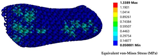 According to Equation (6), and from the results of Figure 9, the c and n constants of the scaling law equation can be identified, and the power of the trendline function is the n constant which is around 1.32. This price is in the normal range for elastomeric thermoplastics. This factor indicates a mild bending-dominated behavior which is an ability that hyperelastic materials possess. The constant of the trendline is equal to Φsolid·c, therefore, the c constant in this situation is 0.37. Therefore, from the utilization of Equation (6) the minimum relative density for the development of an architected material that can stand the maximum calculated stresses of 0.42 MPa is 33%.