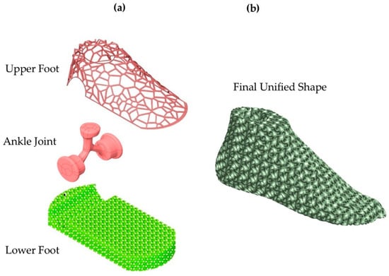 Conceptualization of the above-talus prosthetic design: (a) 3D scanned frame of an actual 10.5 US shoe size human foot and (b) Proposed anthropomorphic design with bioinspired lattice geometries.