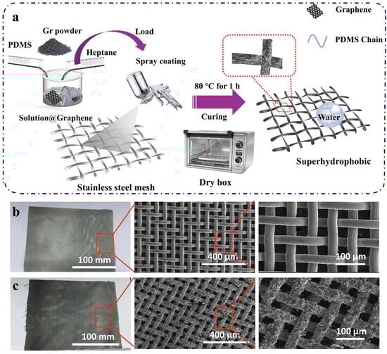 The spray-coating method can be utilized to create coatings for different substrates. SSM, commonly used in our daily life, is chosen for its good stability and soft texture, which allows for easy cutting and bending. Therefore, stainless steel mesh is selected as the skeleton for fabricating superhydrophobic coating in this study. Initially, a diluent solution of PDMS was prepared by mixing heptane and PDMS in a certain proportion. Graphene, reduced from graphene oxide, was incorporated into the PDMS solution, thoroughly mixed using a magnetic stirrer, and then dispersed via ultrasonication for 60 min. The obtained uniform solution was sprayed onto the surfaces of various substrates and then placed in a drying oven for curing later. Figure 1a illustrates the general process of modification of 400-mesh SSM by the one-step spraying method and qualitatively demonstrates the influence of modification on the substrate surface from both macro and micro perspectives.