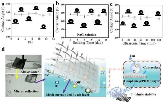 From the stability test discussed, the modified coating retains its superhydrophobicity under various external influences. This unique interfacial property, inspired by nature’s resilient superhydrophobic structures, contributes to the resilience of the coating against the impact of harsh environmental conditions, as demonstrated in Figure 3d. When the corrosion-resistant and robust stainless steel mesh is submerged in water, a notable transition in the surface properties occurs, shifting from the original dull color to a reflective bright white appearance, as seen in the comparative photos above and below the water. This transformation is attributed to the superhydrophobic properties of the mesh, which facilitate the formation of an air layer on its surface, thereby creating a barrier against water contact. In addition to the inherent chemical stability of graphene as a carbon material, PDMS is also stable. Its monomers are continuously supplied to the surface to cover newly exposed stainless steel, caused by poor conditions, which should be the reason for its long-term protection of micro/nano structures [54]. All of these observations indicate that the modified superhydrophobic coating is highly durable, combining chemical and physical stabilities to make it a promising candidate for future practical applications.
