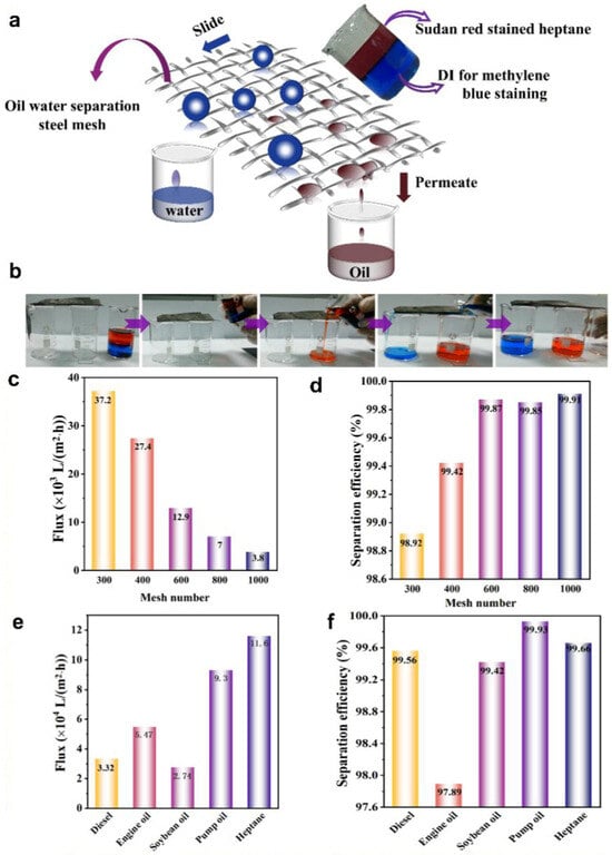 where m0 and m1 are the masses of the liquid phase expelled before and after the separation process, respectively. As shown in Figure 4c, the oil flux decreased with the increase in mesh number of the stainless steel mesh, indicating a slower filtration rate but improved separation efficiency, because stainless steel meshes with higher mesh numbers were more effective in separating soybean oil/water mixtures, as shown in Figure 4d, with the 1000-mesh displaying the lowest oil flux (3800 L·m−2·h−1) and the highest separation efficiency (99.91%) which was better than the Graphene-Based Catalytic Membrane [56,57,58]. Prepared Graphene@PDMS-coated mesh, inspired by biomimetic structures, demonstrate the capability to efficiently and energy-efficiently separate oil/water mixtures and adjust the separation performance by altering the mesh number of the stainless steel mesh. An optimal balance between flux and separation efficiency was found with 400-mesh, as shown in Figure S15. That is the reason why we chose 400-mesh stainless steel mesh as the primary focus of our study. Based on the experiment shown in Figure 4b, we calculated that the wetting phase (heptane) permeated through the sample at a flux of approximately 27,400 L·m−2·h−1, while the non-wetting phase (water) was repelled above the MSSM, achieving an oil filtration rate exceeding 97%, with no contamination observed in the filtrate. In addition to heptane, the MSSM exhibited high durability towards other organic solvents and oils, including diesel, engine oil, soybean oil, and pump oil. The performance metrics for these substances are detailed in Figure 4e,f. Overall, for various oil-based emulsions, the modified hydrophobic coating mesh consistently exhibited a separation efficiency greater than 97%. Calculations revealed that for a range of oil/water mixtures, the MSSM consistently exhibited a separation efficiency greater than 97%. We also conducted the oil–water separation experiment in a vertical direction, as is shown in Movie S3.