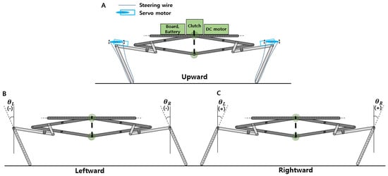 The initial posture of the jumping legs is controlled using miniature servomotors located at each femur, as shown in Figure 3A. The servomotor has two wires, and the wires are connected to the foot of the jumping leg. One wire pulls the foot in a clockwise direction, and the other pulls in a counterclockwise direction. By using two wires, the angle between the tibia and the ground can be adjusted, as shown in Figure 3B,C.