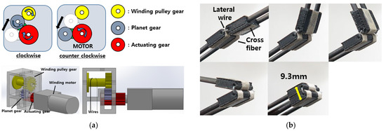 The jumping energy is stored in the torsional springs located at the top and the bottom of the four-bar, as shown in Figure 2B. When the four-bar is fully folded by the loading wire, the jumping energy is maximally stored. The energy is stored and released through a clutch mechanism, as shown in Figure 4a. The clutch consists of three gears and a DC motor. When the motor and the actuating gear rotate in a clockwise direction, the planet gear contacts the winding pulley gear and starts to wind the wire to store the energy. As soon as the motor rotates in a counterclockwise direction, the planet gear detaches from the winding pulley gear, and the stored energy is released.