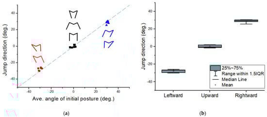 The experimental results are plotted in Figure 6. Figure 6 shows the jumping direction depending on the average angle of the initial posture. The overall jump direction ranges from −30° to 30°. Basically, the jumping direction shows good agreement with the average angle of the initial posture. For example, the robot jumps rightward when the average of the initial angles has a positive value. To evaluate the consistency of directional jumps, the average initial posture angle and the resulting jump direction were plotted for each target direction: leftward, upward, and rightward. Figure 6b presents the distribution of jump direction data across repeated trials within each group. The results clearly show that each jumping direction forms a compact and well-separated distribution. Notably, the upward and rightward groups display very narrow IQRs, reflecting low trial-to-trial variability in those configurations. The leftward group, while showing slightly more spread, remains tightly clustered with minimal deviation.
