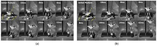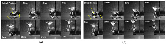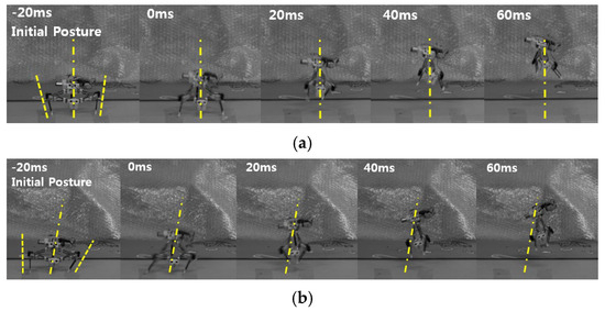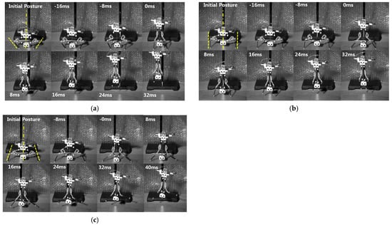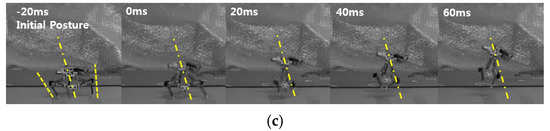 Figure 7, Figure 8 and Figure 9 show the moment of jumping with various initial postures. In Figure 7, the initial postures indicate that the robot has an initial average angle of about 0° so that the robot can jump upward. As shown in Figure 7a–c, all cases take off almost upright, even though each tibia has a different initial angle. Figure 8 shows the rightward jumping. Both Figure 8a,b have equal value of the initial average angle of about 30 °, but they have a difference when it comes to each tibia as well. Figure 8a has an initial angle of about 37° and 22° for the left and the right tibia, respectively. In the case of Figure 8b, the left and the right tibia are adjusted to 9° and 50°, respectively. Leftward jumping is similarly performed, as shown in Figure 9. Figure 9a has an initial angle of about −33° and −28 ° for the left and the right tibia, respectively. In Figure 9b, the left and the right tibia are set as about −9° and −48°, respectively. However, it seems that both cases feature jumps in almost equal directions.