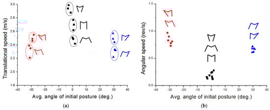 Figure 10b shows the angular speed depending on average angle of initial posture. In the case of upward jumping, the robot rarely rotates with an angular speed of 0.11~0.25 rev/s when it jumps. In leftward and rightward jumping, a bit of body spin occurs with an angular speed of 0.8~0.9 rev/s and 0.6~0.7 rev/s for rightward and leftward jumping, respectively.