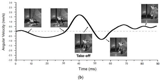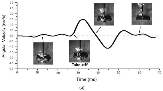 To describe in detail how jumping with reduced body spin occurs, we plotted the angular speed depending on time with the corresponding robot’s posture, as shown in Figure 11. Figure 11a indicates the take-off process of upward jumping case 1-3. When jumping is triggered by the clutch mechanism, the robot hardly shows body rotation before the moment of take-off. Just after take-off, an overshoot of angular speed occurs and instantly converges to near zero. In the case of rightward jumping, the jumping process shows somewhat different behavior. In Figure 11b, the robot’s initial posture is inclined rightward, since the mass center moves to the right. Therefore, when jumping is triggered, the left leg operates first, and the robot starts to rotate in the clockwise direction. Just after the left leg takes off, the robot is affected by a reaction force from the right leg. By doing so, the robot’s body spin is much reduced at the moment of take-off. After take-off, overshoot occurs as well and converges to a certain value of about 0.6~0.7 rev/s.