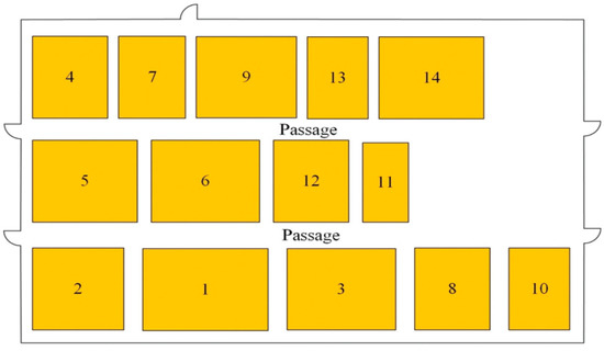 - Floor plan assumption. All work units are on the same plane with no height differences, which conforms to the working scenarios of most enterprises. This assumption cannot optimize the logistics transportation in the three–dimensional direction.