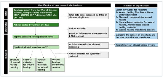 The database list of the included studies was searched for additional eligible publications. The 138 selected papers were divided into four categories (structures, chemical materials, natural materials, and sensors for wound healing) and reviewed in depth. The structures for wound healing were divided into film, foam, gauze, and electrospun nanofibers. The representative materials for wound healing included hydrogels, nanowebs, polyacrylic acid, polyhydroxyethyl methacrylate, and polyacrylamide. In conclusion, this study aimed to provide the foundation for the application of cutting-edge clothing with wound-healing materials and wound monitoring devices.