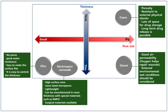 In the case of films, the manufacturing method is relatively convenient, and due to the lack of pores or flat surfaces compared with gauze or nanoweb material, it is more advantageous in terms of external virus protection and waterproofing than other structures. In the case of a film, the pore size is 0 nm, and when the electrospinning nanoweb thickness (nonstretch state) is 20 to 60 μm, the pore size is about 272 to 473 nm [28]. Therefore, since the film does not have pores, the effect of blocking the inflow of viruses is better than that of the nanoweb or gauze.
