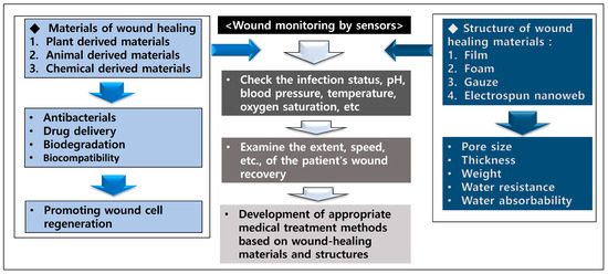 With the recent development of advanced industries, in addition to simple abrasions, the demand for wound dressing is gradually increasing in fields such as diabetes care. Factors affecting wound healing include pH, temperature, genetic factors, stress, smoking, and obesity, and studies on these are also increasing. In addition, studies on hydrogels, electrospun nanofibers, foams, films, plant-based materials, chitosan, gelatin, 3D printing, and chemosensors for wound healing are also increasing. However, although there are many data related to wound healing, there are not many studies that have systematically divided them into structures, materials, and monitoring through a review of the literature. Therefore, based on various studies on wound healing, wound-healing materials were classified into structures (films, foams, gauzes, and electrospun nanofibers), chemical materials, nature-based materials, and monitoring sensors, and a literature review was conducted.