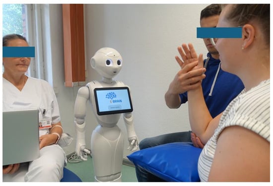 https://www.ebrain-science.de/en/home/; accessed on 7 March 2025)) used in this research employs a humanoid robot to guide stroke survivors through therapy sessions, offering instructions, feedback, and motivation [