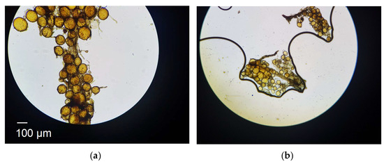 Figure 1a shows the initial colonisation of the root by AM fungal spores. The round structures are the reproductive structures of AM fungi known as spores. When spores settle on and colonise the root lamina [8], they germinate, creating hyphal networks―thread-like structures that penetrate the soil. The filamentous structures in Figure 1a are the hyphae connecting the spores. Figure 1a illustrates the growth of hyphae from spores. The growth of these hyphae pushes soil particles apart, expanding the pore structure and increasing overall porosity. This mechanical rearrangement of soil particles modifies both the infiltration characteristics and the hydraulic conductivity of the soil [9]. As hyphae infiltrate the soil, they not only create additional voids (thus increasing air volume and porosity) but also secrete exudates, which act as natural binding agents, linking soil particles together. This biotic binding process enhances the structural integrity of the soil while reducing the overall volume of bulk water as hyphae consume it for growth. The result is a more cohesive soil structure with improved aeration, higher porosity, and increased resilience against erosion [10,11].