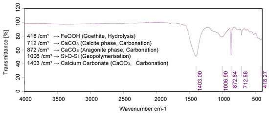 Initially, hydration of calcium oxide (CaO) from the PM forms calcium hydroxide Ca(OH)2, which further hydrates to hexaaquacalcium(II) ions or [Ca(H2O)6]2+. The hydration leads to the formation of a complex, honeycomb-like structure resembling the spores of mycelium (see Figure 1). Concurrently, sodium silicate undergoes hydrolysis, enabling deprotonation of the clay fraction and the formation of a sodium aluminosilicate geopolymer, which acts as a binder. Carbonation reactions follow. Ca(OH)2 reacts with CO2 to form precipitated calcium carbonate (CaCO3). In Figure 2, the 1403 cm−1 peak is associated with the precipitated carbonate. The peaks at 872 and 712 cm−1 are representative of Aragonite and Calcite polymorphs. Precipitation and progressive evolution of Aragonites to Calcites are discussed in detail in Assadi-Langroudi et al. [14], which interested readers are encouraged to read and expand. The presence of ferric oxides (Fe2O3) within the PM promotes hydrolysis and the formation of goethite (α-FeOOH)―with a peak at on the diffractogram in Figure 3, which acidifies the system and competes for CO2 reactivity, delaying carbonation by forming a protective layer around Ca(OH)2. The 418 cm−1 band reaffirms the presence of goethite. Pozzolanic reactions take place as silicate and aluminate species interact with calcium, forming calcium silicate hydrate (C-S-H) and calcium aluminate hydrate (C-A-H) gels, which contribute to strength development. Cautiously put, the broad peak around 29°2θ and the hump at 35°2θ on the diffractogram in Figure 3 represent the C-S-H and C-A-H phases. Organic molecules in the PM, particularly polysaccharides, act as nucleation sites or adsorption agents for C-S-H, influencing gel structure and hydration pathways. Water bridging occurs through hydrogen bonding between [Ca(H2O)6]2+ and ether groups in organic molecules, facilitating a controlled growth of cementing gels while regulating porosity. Figure 4 illustrates the nucleation of gels among the trio of the ether group, deprotonated clay, and hexaaquacalcium(II) ions. In Figure 4, the Ca2+ ion bridges with Si-O groups and H2O ligands, indicating C-S-H formation. Despite the pozzolanic potential, limited alkalinity due to the low A/PM ratio and progressive water retention by organics result in incomplete geopolymerisation, restricting the extent of strength gain and carbonation.