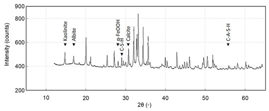 This strength trend is consistent with the following mechanisms: A15 and A19, with higher degrees of saturation (≥0.55), support extensive hydration and early-stage geopolymerisation. As S drops (A21–A29), strength remains comparatively high due to continued formation of C-A-H and C-S-H gels, supported by some residual water and alkali availability. However, at A33 and A35 (S ≤ 0.2), water becomes insufficient for complete hydration of Ca(OH)2 and activation of silicates and aluminates, leading to incomplete geopolymerisation. The presence of ferric oxides increasingly competes for CO2, delaying or suppressing carbonation. These effects collectively explain the fall in strength, particularly at A35, despite continued porosity and apparent treatment.