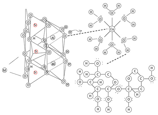 Lewis structure of deprotonated clay following alkali activation, hexaaquacalcium ion from hydration of calcium oxide of pressmud, and organic molecules.