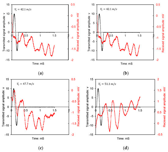 Time domain plot of acoustic emission tests (bender element): (a) base soil, (b) sample A15, (c) sample A21, (d) sample A29. Note, denotes shear wave velocity.