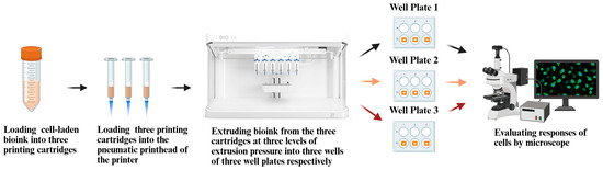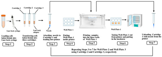 In this study, triplicate samples were printed at each of the three extrusion pressure levels (50, 80, and 100 kPa). The cell-laden bioink, prepared by following the procedure described in Section 2.3, was loaded into separate cartridges for each extrusion pressure level. After printing, each well plate containing the samples was immediately placed in a humidified incubator. The levels of extrusion pressure were selected, based on preliminary printing tests, to ensure filament continuity and sample fidelity for the specific bioink concentration and nozzle size. Pressure levels outside this range could not produce comparable samples. The steps for 3D printing the samples are illustrated in Figure 2 and described below.