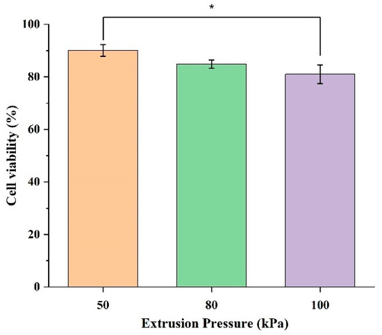 Cell viability of HBE cells encapsulated in 3D printed samples at three extrusion pressure levels (50, 80, and 100 kPa). Each bar represents the mean ± standard deviation from triplicate samples; * indicates p-value < 0.05.