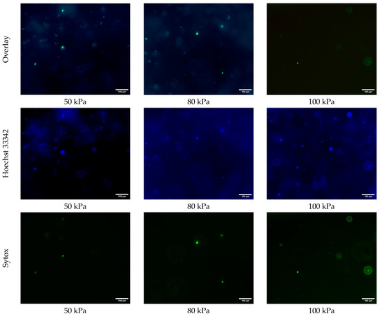 Figure 4 shows the fluorescence microscopy images of the samples printed at extrusion pressures of 50 kPa, 80 kPa, and 100 kPa, stained with Hoechst 33342 (blue) for all cells, and Sytox (green) for dead cells. For the samples printed at an extrusion pressure of 50 kPa, the overlay image demonstrates a healthy distribution of cells, as indicated by the prominent blue Hoechst 33342 staining. The Sytox signal in green is sparsely present, indicating minimal cell death at this extrusion pressure. The Hoechst 33342 images in Figure 4 show that the number of all cells is noticeably higher in the samples printed at an extrusion pressure of 50 kPa than those that are printed at an extrusion pressure of 80 kPa and 100 kPa. This observation suggests that a higher extrusion pressure may negatively affect cellular functions, as fewer cells were detectable by Hoechst staining. However, no direct assessment of metabolic activity was performed. This is likely because a higher extrusion pressure causes cellular damage. In other words, at higher levels of extrusion pressure, the shear stress overwhelms the cells’ ability to maintain homeostasis, and, consequently, reduces cell viability.