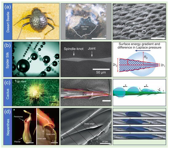 Directional liquid transport on natural systems: (a) desert beetle [1]; (b) spider silk [2]; (c) cactus spine [3]; (d) Nepenthes peristome [4].
