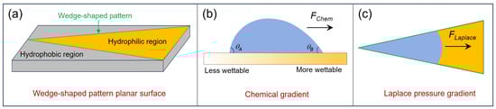 where R0 is the droplet radius, γwater is the surface tension of water, θB (advancing) and θA (receding) are contact angles at hydrophilic and hydrophobic regions [14,15] (Figure 2b). Experimental validation by Chaudhury and Whitesides [16] demonstrated this principle through silane-based surface modifications, achieving uphill water droplet transport. For wedge-shaped pattern structures, the driving force exerted on the liquid by the surface energy gradients generated in the hydrophobic regions outside the wedge-shaped pattern and the hydrophilic regions inside the wedge-shaped pattern structure can be expressed as follows: