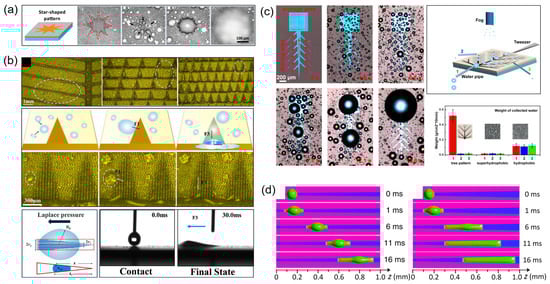Water harvesting on wedge-shaped pattern surfaces [17]: (a) star-shaped patterns [59]; (b) wedge-shaped branches; (c) tree-shaped hierarchical cones [23]; (d) numerical simulations [25].