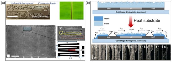The current research paradigm is transitioning from static surface properties to dynamic phase-change regulation under extreme conditions, driven by the need for adaptive thermal management solutions. The synergistic “de-blooming” phenomenon [50] observed on biphilic (superhydrophobic/hydrophilic) surfaces enables rapid surface renewal through coordinated interactions between superhydrophobic and hydrophilic regions (Figure 5b). This breakthrough originates from the manipulation of interfacial energy gradients and phase-transition kinetics, a concept previously unexplored in condensation research. When the dimensions of the superhydrophobic domain are optimized, satellite droplet retention is dramatically reduced, enabling frost-free operation on vertical surfaces—a critical advance that directly addresses operational challenges in HVAC&R systems. Importantly, this mechanism integrates condensation and defrosting processes, offering unprecedented energy efficiency in cyclic frosting environments. Despite these transformative achievements, long-term stability under complex operational conditions remains a key challenge. Moving forward, future research should focus on integrating machine learning-optimized fractal layouts with multifunctional anti-icing capabilities, accelerating the transition from laboratory prototypes to industrial-scale applications.